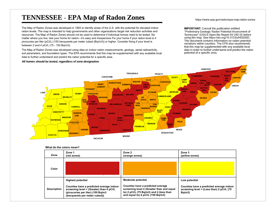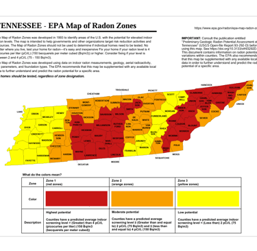 Radon is a well-documented concern in East Tennessee because of the region’s bedrock and soil formations which include uranium baring carbonate rocks and shale. Radon gas releases from naturally occurring uranium decay products in these substrates and radon gas can seep into houses built here.
